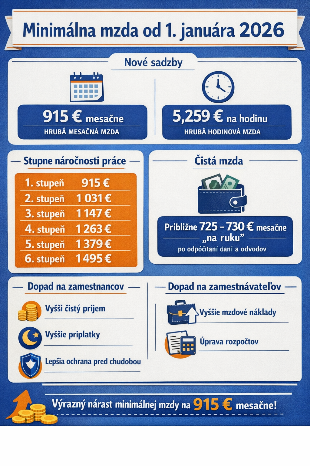 🗓️ Minimálna mesačná mzda: 915 € hrubého mesačne.